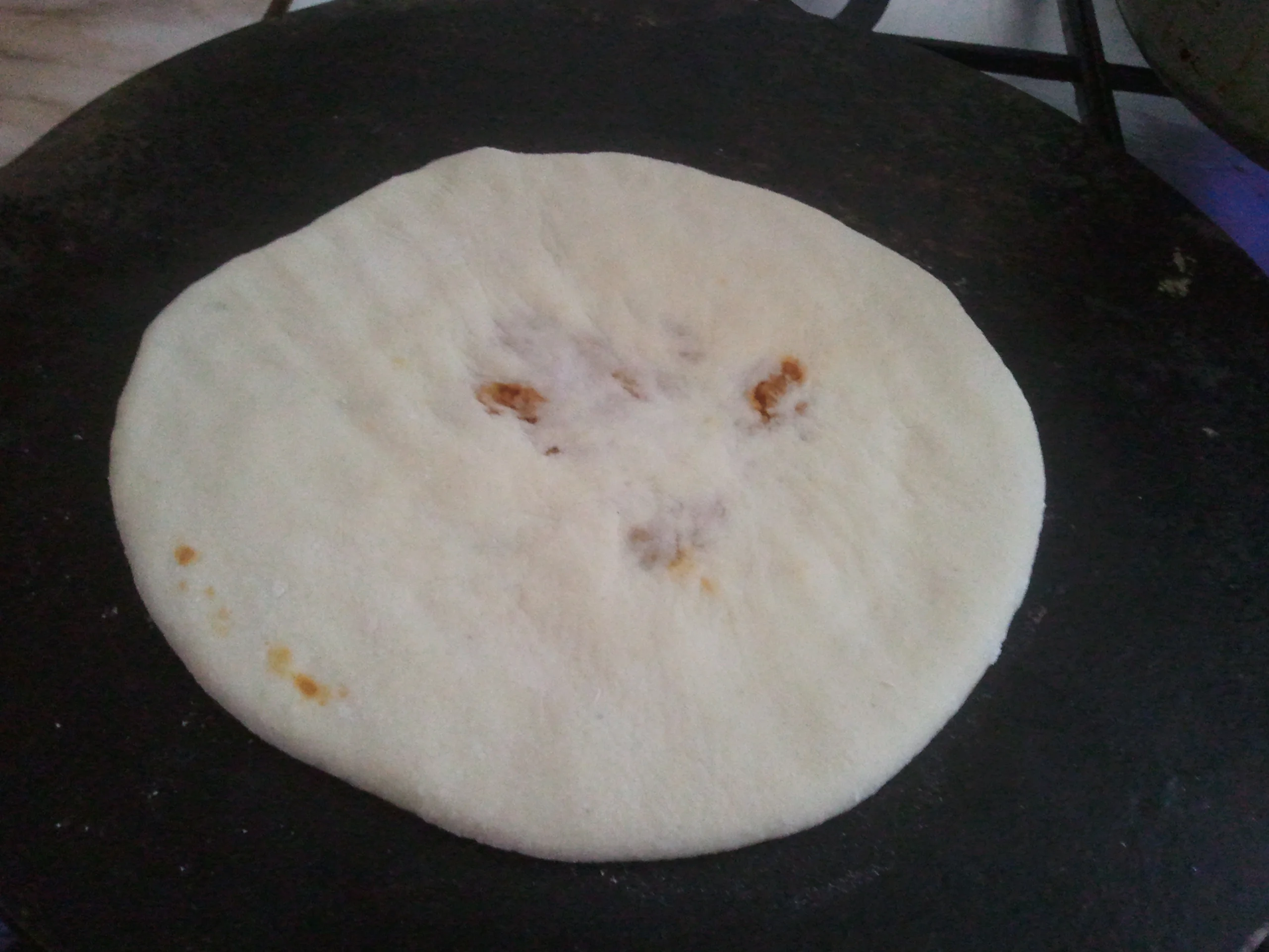 نحطو صفيحة او طاجين او مقلاة ثقيلة تسخن فوق النار و نرشوها بالزيت و نحطوا فوقها الخبزة و تكون النار متوسطة ....كي يتحمر الوجه الاول نقلبوها على الوجه الثاني