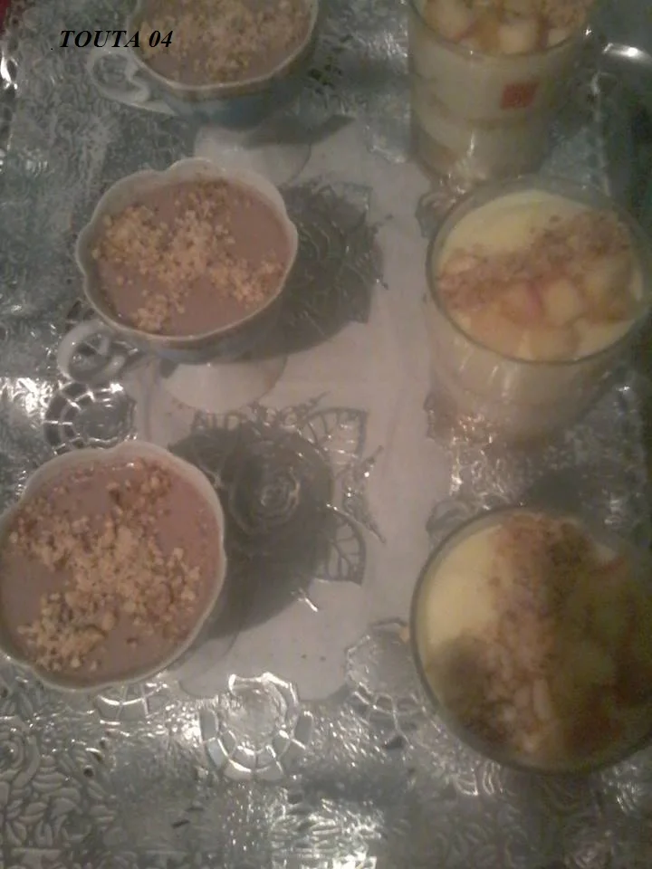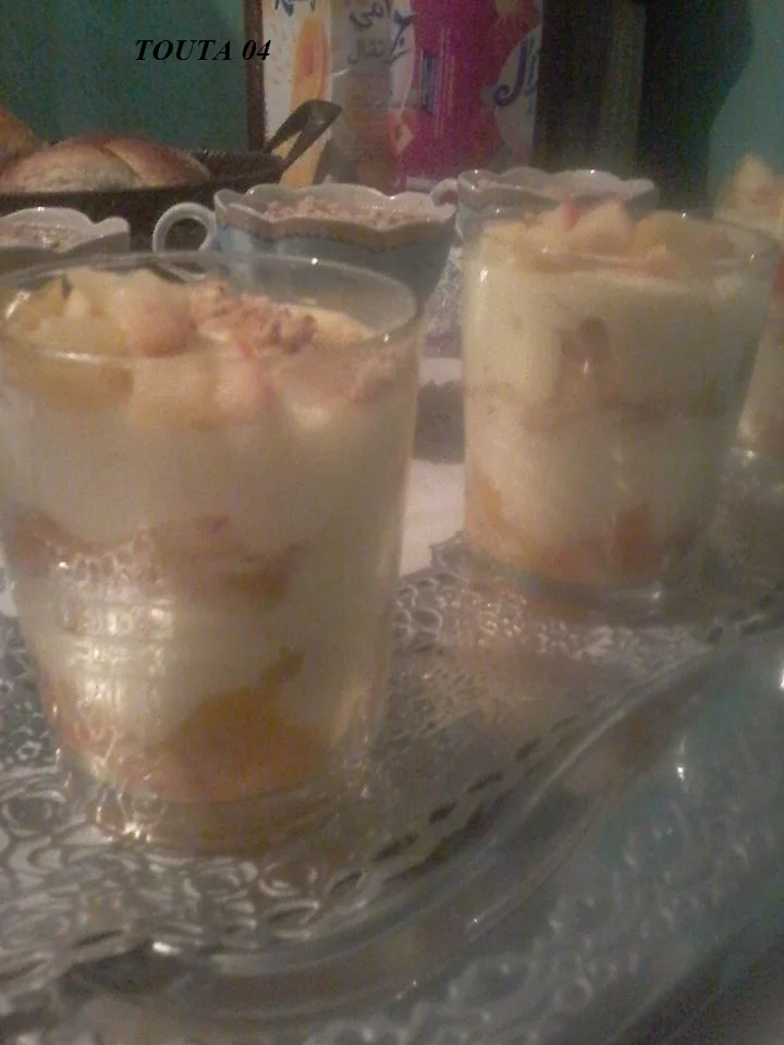 و هذا فلون و تحلية بسيطة بالفواكه مقطعة كرملتها بالكريمة الانجليزية و الكاوكاو طبقات