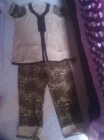هدي بيجامة تاع وحدة خيطتها جابتلي كتان النمر وقاتلي ديريلي بيجامة انا قتارحت عليها دير كتان لفوق من لون ولتحت دير سروال من كتان النمر وهاهي النتيجة نتمنى تعجبكم