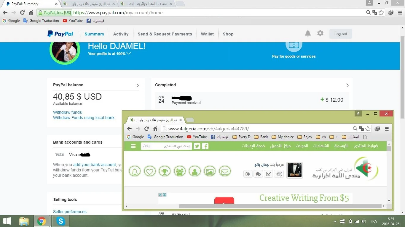 متوفر للبيع 40 دولار على باي بال ، سعر البيع 175 دج للدولار الواحد