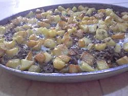 في مول الفرن حطي طبقة عدس ثم طبقة بطاطا ثم شكشوكة ثم الباقي من العدس و في الاخير بطاطا