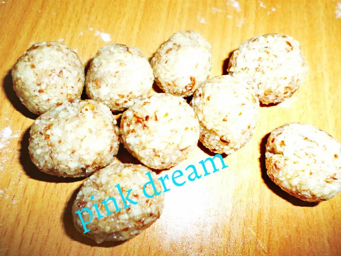 {كيلة لوز بنص كيلة جوز وكيلة غي شوية سكر وماء زهر للم الحشو وفاني}