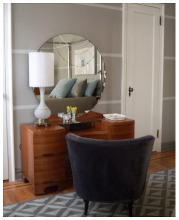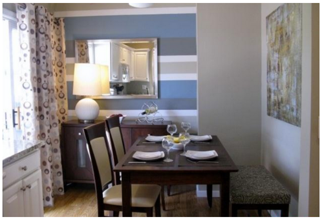ان استخدام خطوط عرضيه من نفس النمط المتكرر ونفس درجات اللون المختار لباقي الغرفه يعطي عمقا للغرفة الصغيره اذا كانت الخطوط العرضيه بحجم معقول أو صغير ومتفاوت مثال على ذالك الصوره التالية: