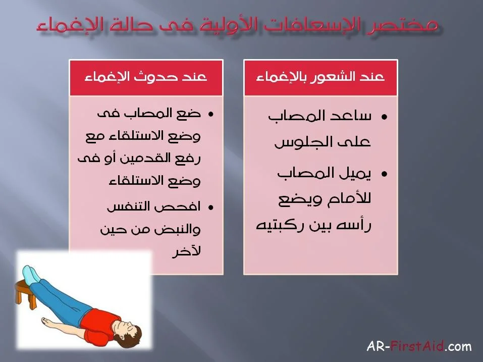 كرفع رجلي المغمى عليه بحوالي 40 سم و هو مستلقى على الظهر و سحب الرأس إلى الخلف لفتح مجاري الهواء