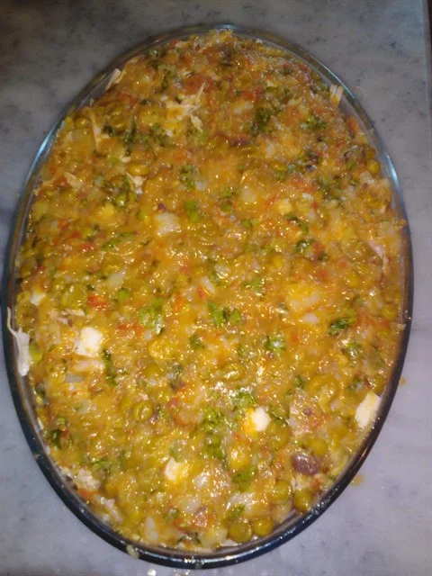 بعدما طابوا جبت مول تاع زجاج دهنتوا و فرغت فيه الروز لي كنت درتلو توابل و معدنوس و درت فوقو الجزر و طبقة بطاطا و فوقها شوية دجاج و زدت درت طبقة بطاطا و فوقها دجاج