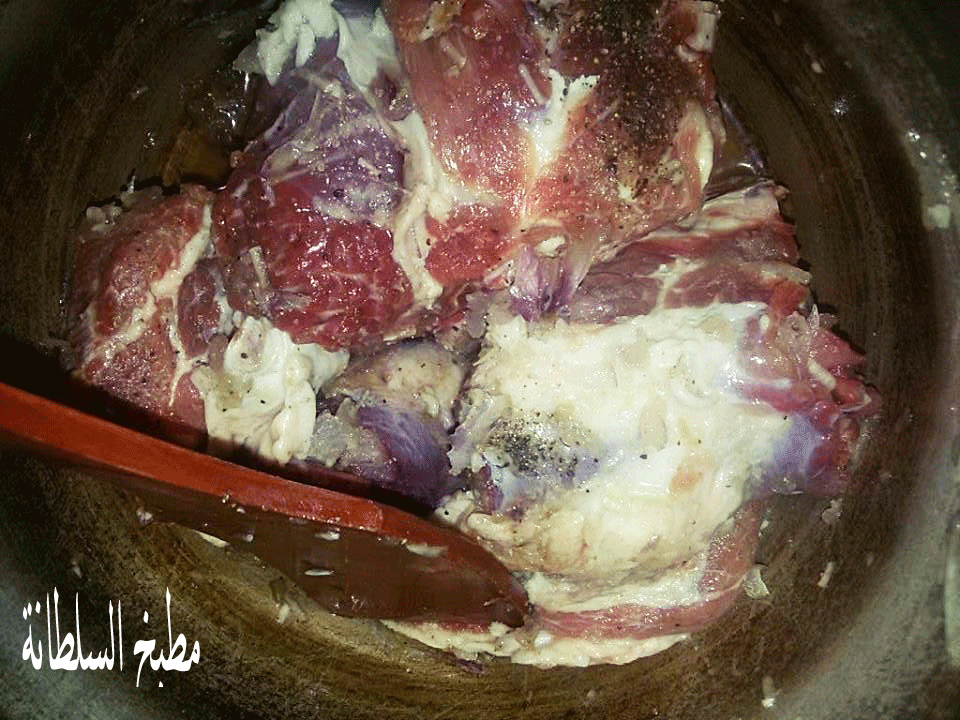 اضع في قدر اللحم +البصل والثوم+الملح+الفلفل الاسود+الحمص +الفلفل الحار حسب الرغبة