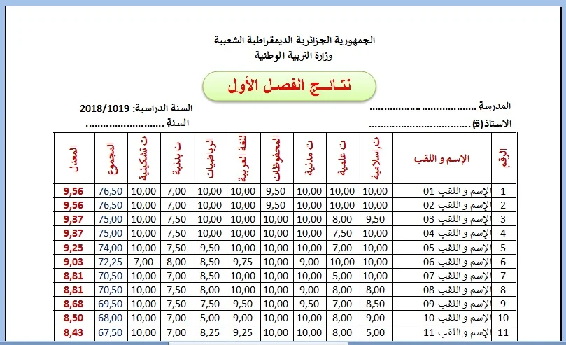 هذا الملف يساعد الأستاذ على إجراء حساب معدلات النتائج الفصل للتلاميذ، ما على الأستاذ فقط إدخال أسماء التلاميذ و نقاط المواد، المجموع و المعدل يحسب آليا. تحميل الملف من هنا تحميل شرح إستعمال الملف من هنا و السلام