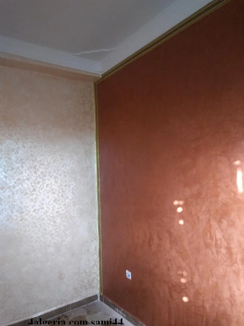 الغرفة مزجنا فيها نوعين من الطلاء الديكوري النوع الاول هو الليوبار الي ادرجنا نا عنه موضوع سابقا وهو باللون الوردي