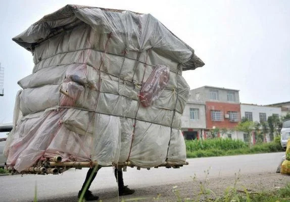 البامبو وأكياس البلاستيك، ويضع قطع من الأقمشة.