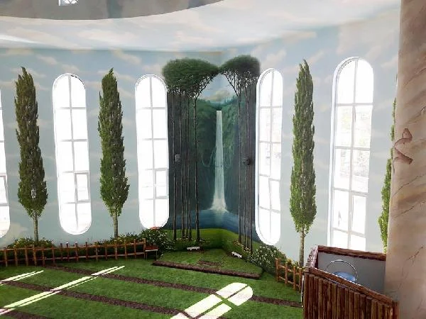 يتراءى للداخل إليه مشهد حديقة غناء محاطة بأشجار الحور، وأرضية عشب خضراء وسقف كأنها قبة السماء، ومحراب خلفه شلال نهر يلفت انتباه الناظرين.