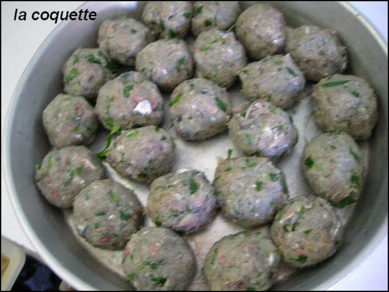 نضع الثوم مفروم و المعدنوس و شوية بصل مفروم و الارز المطحون و نحركوا مليح