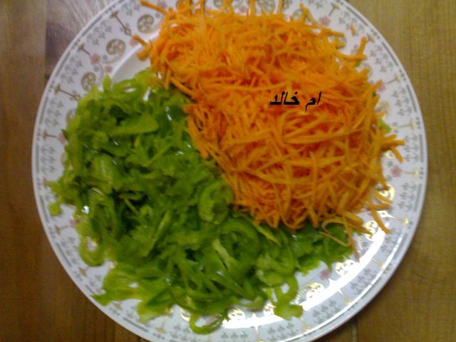 اقلي بصل في قليل من الزيت ثم اضيفي له الجزر والفلفل واضيفي له الملح والبهارات